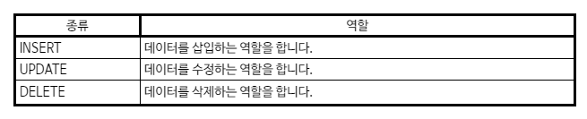 Data 조작어 정의된 DB에 입력된 레코드를 조회하거나 수정하거나 삭제하는 등의 역할을 하는 언어를 말합니다.
