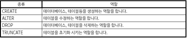 ⇒ Data 정의어, DB를 정의하는 언어이며, 생성, 수정, 삭제하는 등의 데이터의 전체의 골격을 결정하는 역할을 하는 언어 입니다.
