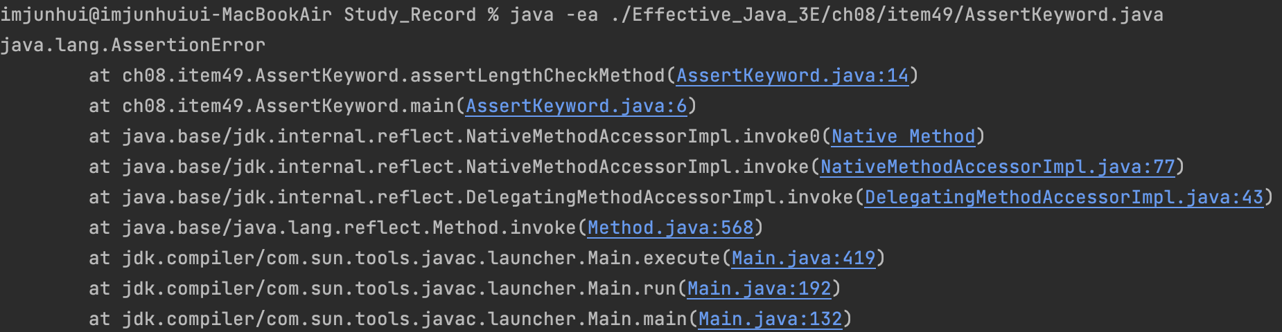 공개 되지 않은 메서드에서 단언문(assert)를 통해 매개변수 유효성을 검증할 수 있다. 단언문에 참이 되어야 하는 조건을 부여하여 거짓이 반환 되었을 경우 실패하면 AssertionError를 던진다. 단순 옵션 없는 런타임에는 영향이 없지만 -ea (--enableassertions) 옵션을 통해 런타임 시점에 확인 가능하다.