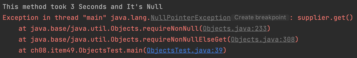 Null 유효성 검사의 메서드 중 Supplier Interface를 인자로 받는 메서드도 제공한다. Supplier Interface의 지연 연산의 이점을 활용한 예제이다.