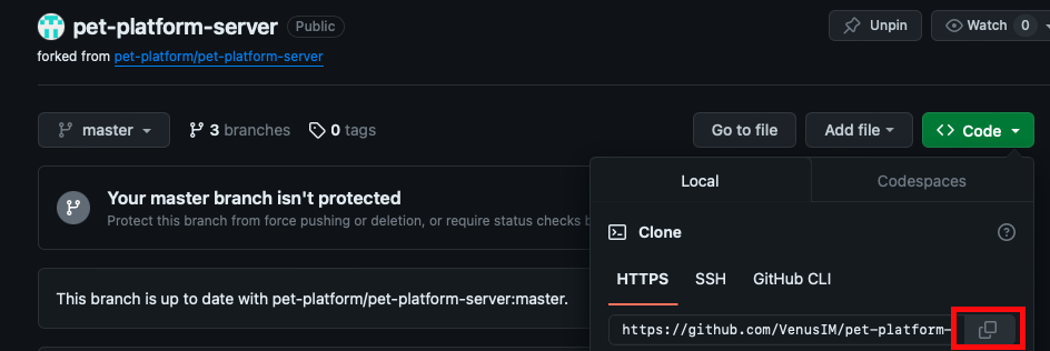 fork해온 repository의 clone 주소 복사