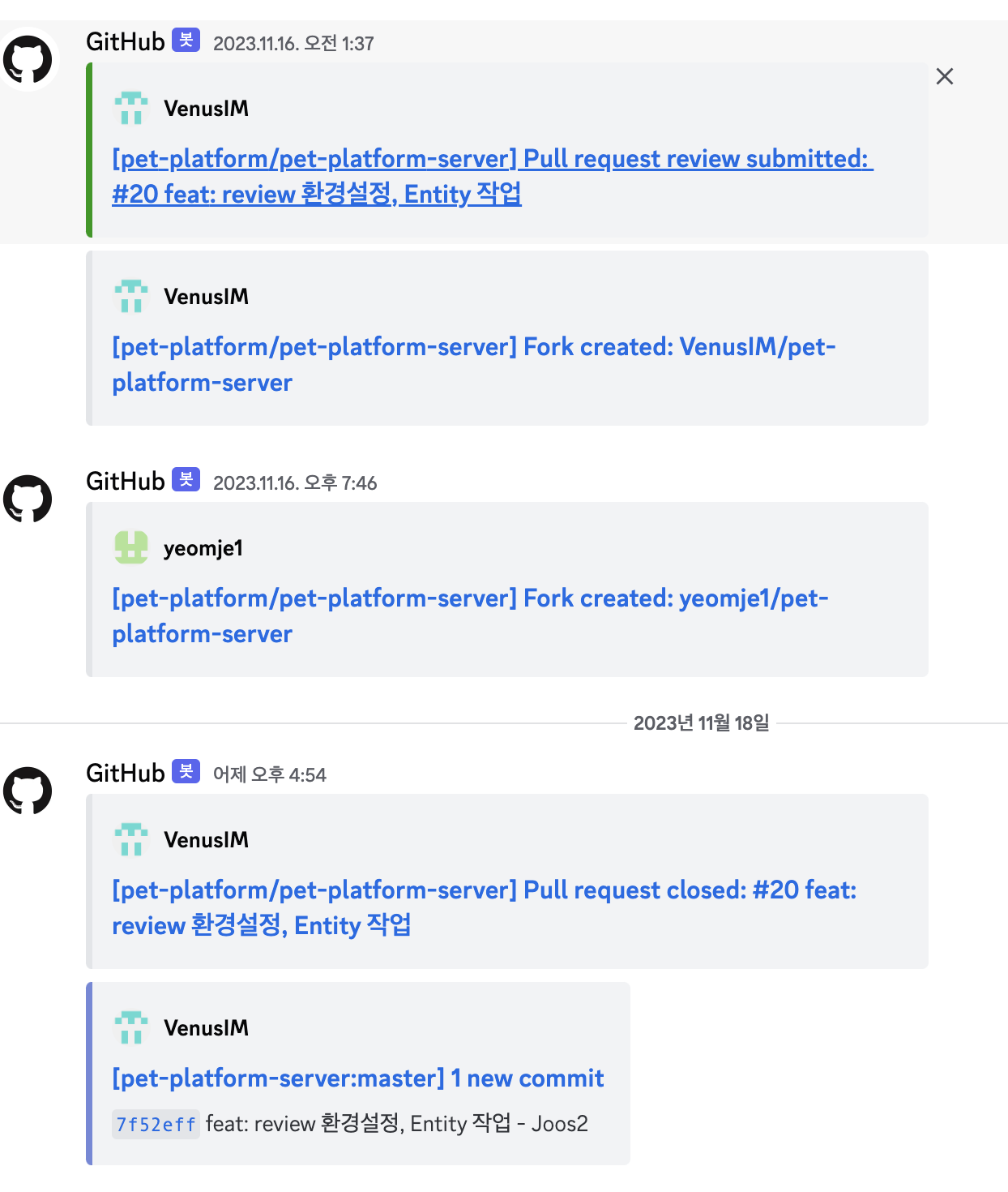 현재 프로젝트에서는 PR issue와 관련된 사항이 변경될때 마다 discord를 통해 알림을 받도록 설정해 두었다.