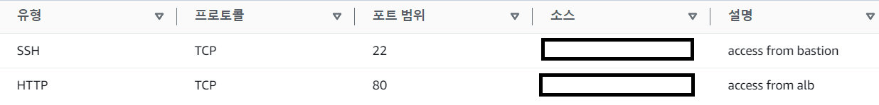 - private subnet에 위치한 test-web-01-a의 Security Group의 경우 bastion으로 부터 접근하는 ssh port와 alb로 부터 접근하는 80 port가 허용 되어 있습니다.