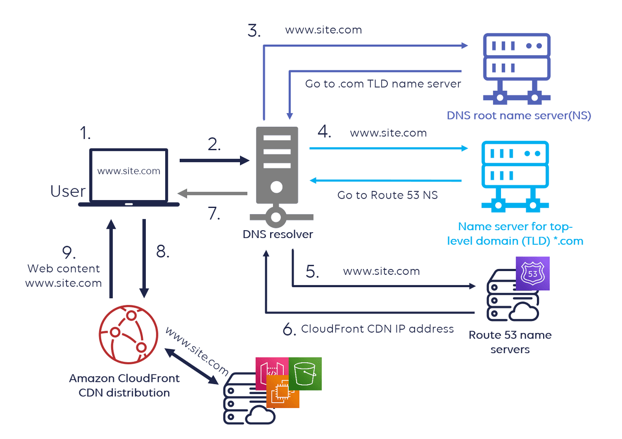 8. 웹 브라우저는 www.site.com에서 CloudFront 배포의 IP 주소로 요청을 보냅니다.