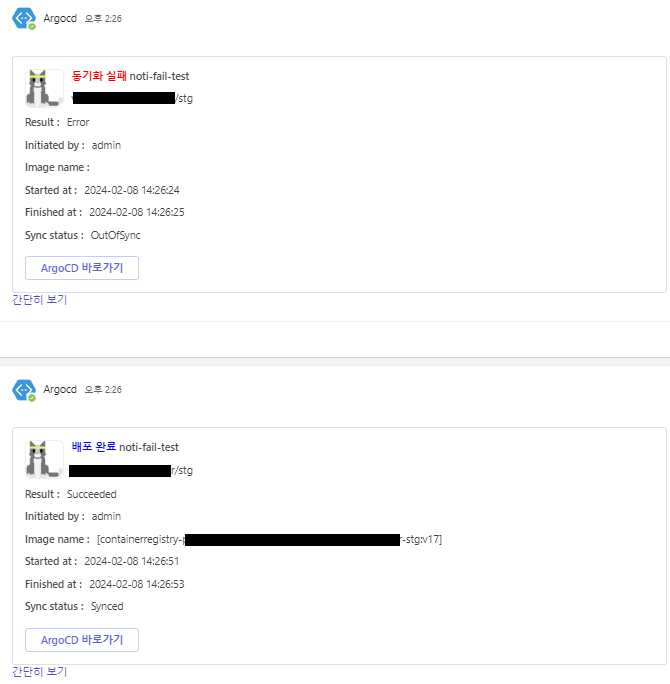 배포 성공 / 동기화 실패 / degraded 상태일 때 template에 설정한 내용을 전송하도록 설정하였습니다.