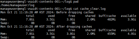 LOG_FILE="/home/user/log/cache_clear.log" get_cache_info() { free -h } echo "$(date): Before dropping caches" >> "$LOG_FILE" get_cache_info >> "$LOG_FILE" echo 1 | sudo -s sync echo 1 | sudo -s tee /proc/sys/vm/drop_caches echo "$(date): After dropping caches" >> "$LOG_FILE" get_cache_info >> "$LOG_FILE"