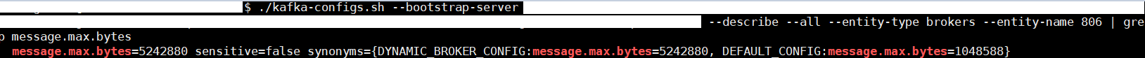 kafka-configs.sh --bootstrap-server broker1:9092,broker2:9092,broker3:9092 --describe --all --entity-type brokers --entity-name 806 | grep message.max.bytes