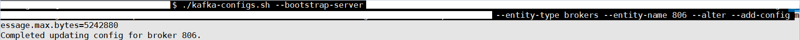 kafka-configs.sh --bootstrap-server broker1:9092,broker2:9092,broker3:9092 --entity-type brokers --entity-name 806 --alter --add-config message.max.bytes=5242880