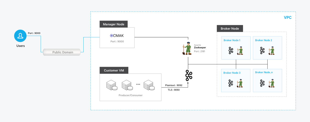 kafka의 경우 cloud data streaming service를 이용하였다. Apache Kafka를 설치하고 설정하여 클러스터 형태로 제공해 주고, CMAK을 이용하여 클러스터 토픽 생성 및 변경 등 kafka 클러스터 관리 기능을 제공한다.