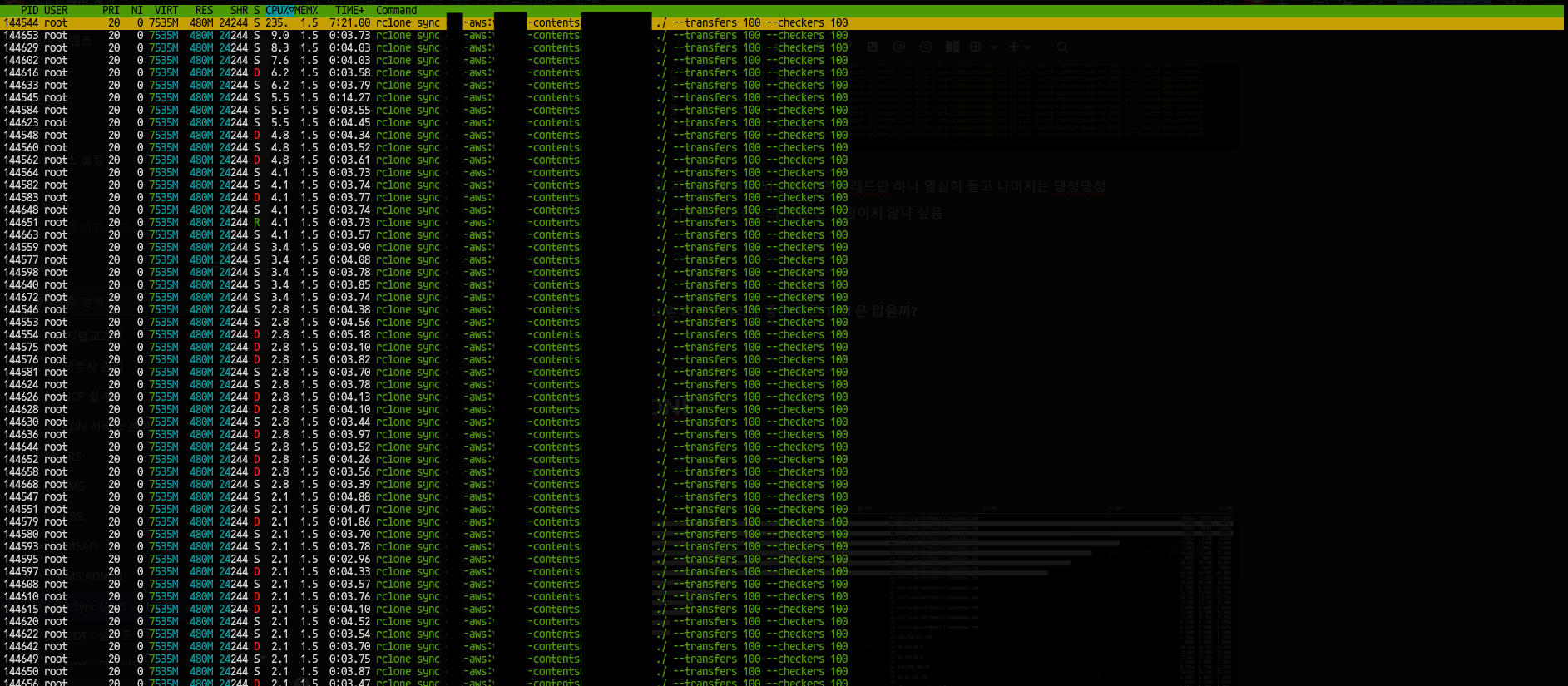 모든 프로세스들이 병렬로 쪼개지며 CPU 팍팍 쓰면서 파일을 복제해 온다.